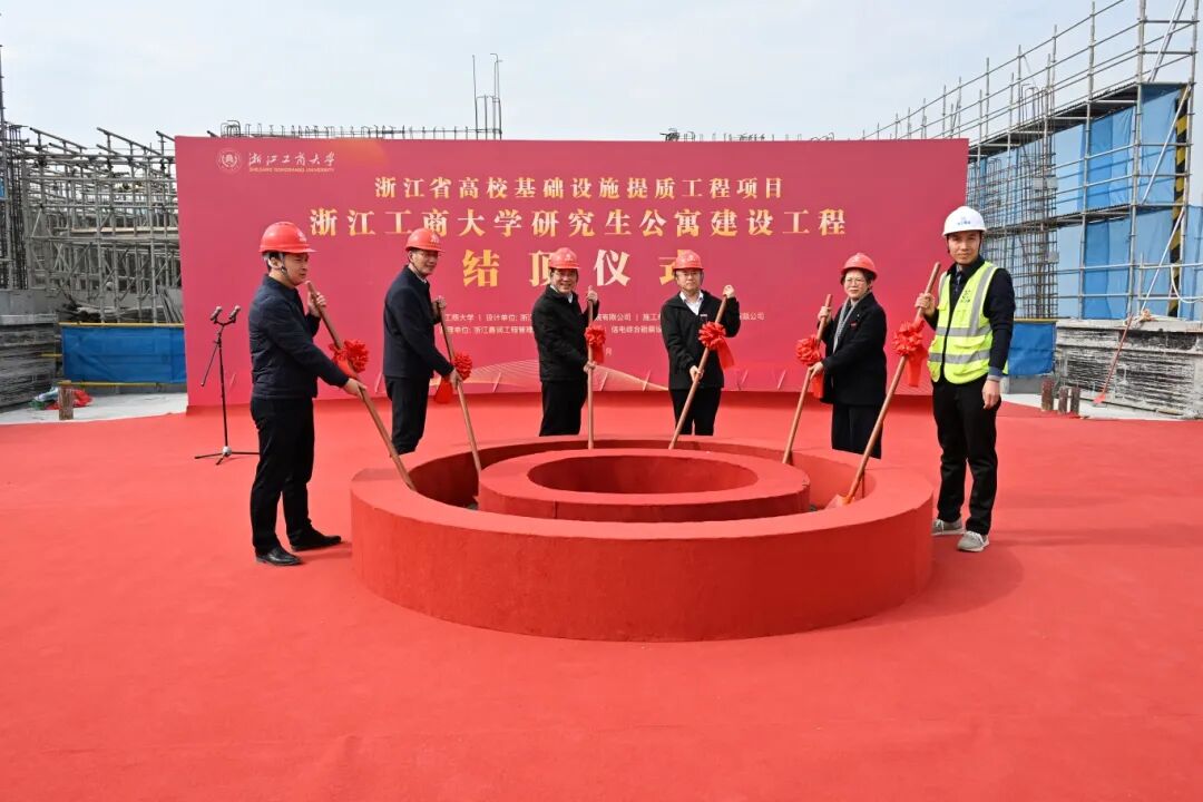 11月24日上午,浙江工商大学研究生公寓建设工程结顶仪式顺利举行。校党委书记郁建兴、校长王永贵、党委副书记方向明及学校相关职能部门负责人、各参建单位代表齐聚现场,共同见证这一重要时刻。仪式由副校长毛秋红主持。